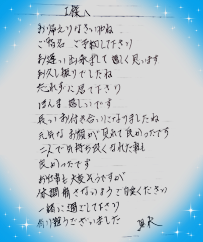 寒くなって来ましたね。 もう、外は コート着やなあかんね。 そんな中 お逢い出来ました。 貴方様に、心を込めて 有り難うの、お手紙を ![]() 貴方様に、お逢い出来ました事に ひとえに、感謝しております。 スタッフ様、ドライバー様 有り難うございました。 日々、日記を見て下さる 皆様方、有り難うございます。 オキニトークからの お優しいお言葉 有り難うございます。 おやすみなさい。 kuroki |