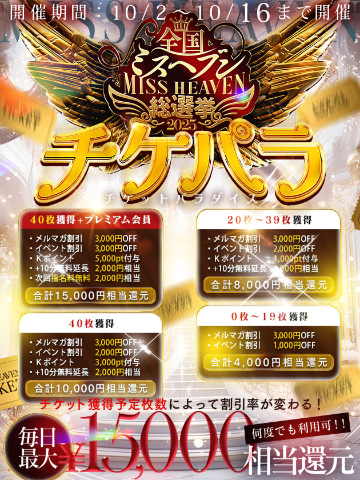 昨日もUPしましたが、 今日初めて見る♡という方も いらっしゃると思うので、 イベント期間中は 毎日UPしていきますね♡ ,.。:*;+゜+;*:。.,,.。:*;+゜+;*:。.,,.。:*;+゜+;*: 昨日から10月16日までの ロングラン♪で… 新しいイベントがスタート♡ しております♡ ♡ ![]() 10月28日から始まる総選挙 に合わせた♡ 割引イベントになります♡ 割引の金額は… お客様個人個人で… 投票できる権利チケット枚数に応じた 割引金額となっております♡♡ ♡今すぐ♡♡お持ちの投票チケット枚数を♡ チェック♡してみましょう♡ ♡♡イベントご利用には、 獲得予定枚数のスクリーンショット♡が 必要になりますので こちらを是非ご確認ください!! ♡画面左下にあるマイ●●●トップを クリック ![]() ♡画面中央の″獲得予定枚数を見る″ をクリック ![]() ♡″獲得予定チケット″を開く ![]() ♡♡この画面で枚数が確認できるよ♡ ![]() 何枚あったかな〜♡??? ♡投票チケットを増やすためには♡ ♡ ![]() これで40枚はGETできます♡♡ オキニトーク♡何でも良いので 是非送ってくださいね♡♡ ご予約は是非ネット予約を ご利用ください♡ 渚ゆり ♡♡♡♡♡♡♡ |