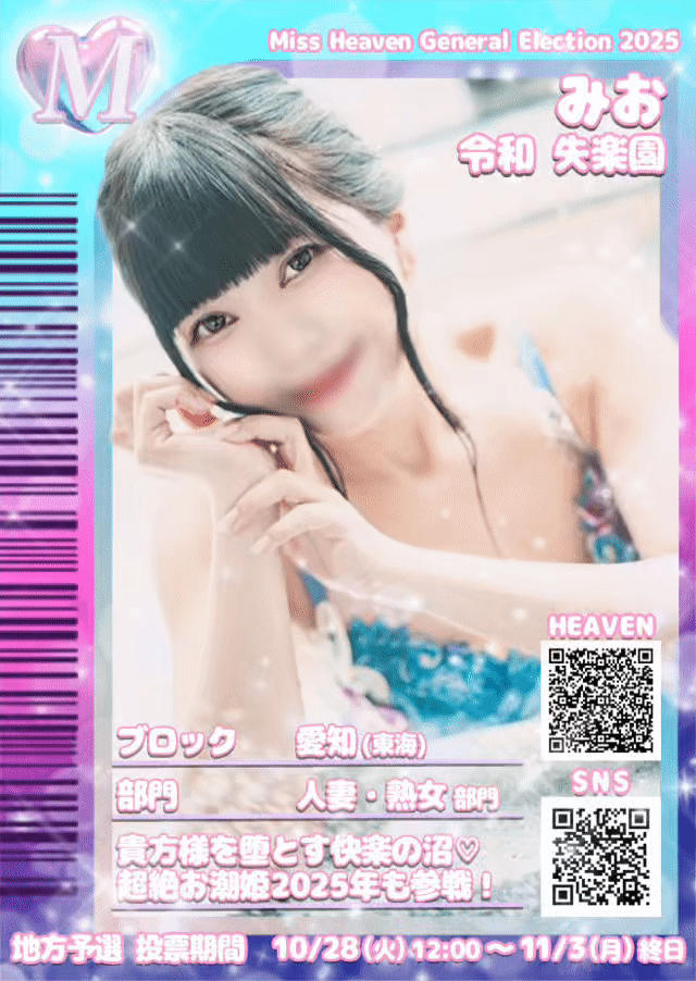♡ミス●●●総選挙2025♡![]() 今年もエントリーすることが 決まりました♡♡♡ ずっとお愛している貴方様も みおとお愛できていない貴方様も みおの日記を見てくださってる皆様 是非応援ご投票 よろしくお願いします♡♡♡ ![]() 9/1〜10/16のチケット獲得期間までに ♡●●●ネット会員登録♡ ♡会員情報16項目入力♡ ♡●●●ネットからのご予約♡ よろしくお願いいたします…♡♡♡ ![]() 絶対投票するよって貴方様は 「みたよ」してくださいね♡ 貴方様のみおより♡ |