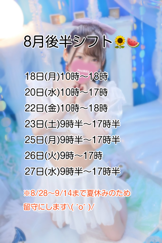 ♡♡・・・・・・・・・・・・・・・・・・・・・・・・・・・・・・・♡♡ 週末の♡情報です♡♡♡ ♡♡22日(金)10時〜18時 ![]() ♡♡23日(土)9時半〜17時半 ![]() 14時45分〜♡ 空き枠多めで寂しいので♡ まだまだお誘いお待ちしてます♡♡♡ 今週末の出勤のあと 週末の出勤は9/15までありません♡♡♀♡ ![]() おと♡♡ ♡♡・・・・・・・・・・・・・・・・・・・・・・・・・・・・・・・♡♡ |
