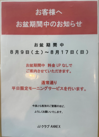 | こんにちは♡♡ あいにくの雨ですね(´・ω・`) 知ってる方も知らない方にも朗報です♡♡  お盆期間中もモーニング適用となります♡♡♀♡ アネックスさん頑張ってます  この機会に 是非アネックスにお越しくださいね♡ 浴衣姿の可愛い女の子達と 元気なスタッフさんが 待ってますよ(*´ω`*) 本日アネックスに行かれる方は 気を付けて向かってくださいね  マイガール、みたよ ありがとうございます♡ 今日もアナタにとって 素敵な一日になりますように♡♡ ♡Ami♡ |