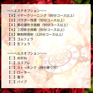 ![]() こんばんは♡ メンエスプラスにお店が リニューアルして 変わったところの お知らせです エステコース ヘルスコースが選べるように なりました。 それぞれオプションで よりお楽しみできる 内容です♡ ![]() これはいちは♡の オプションです♡ 女の子によって できるオプションが 異なります 確認してね OL制服はそのままですよ♡ だけど、、 ストッキングが 別料金になります そしてお持ち帰りOK♡♡♡♡ まえにあった 下着お持ち帰りは オプションからも なくなってます 詳しい料金や内容は HPやお店へお問い合わせ よろしくお願いします♡♡ ![]() |
